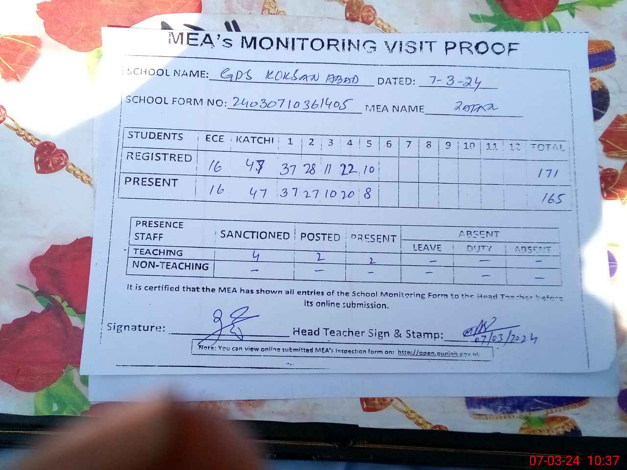 | Certified that this School was Inspected by the Undersigned MEA/DMO Today and the Information Stated Above is as Per Record. | |||||