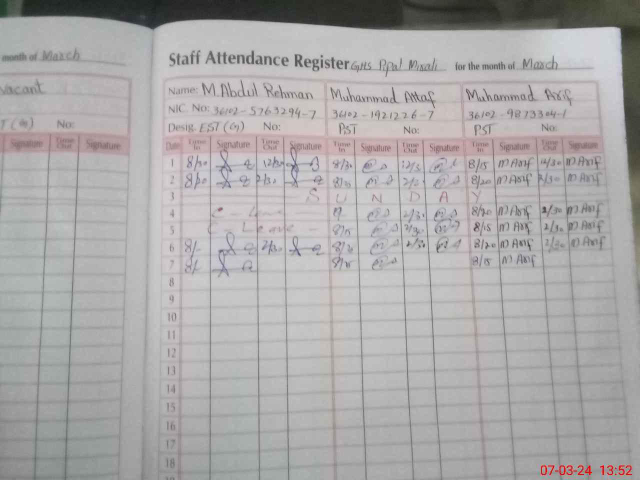 | CNIC | Full Name | Designation | R/C | Absence during last cal. month |
