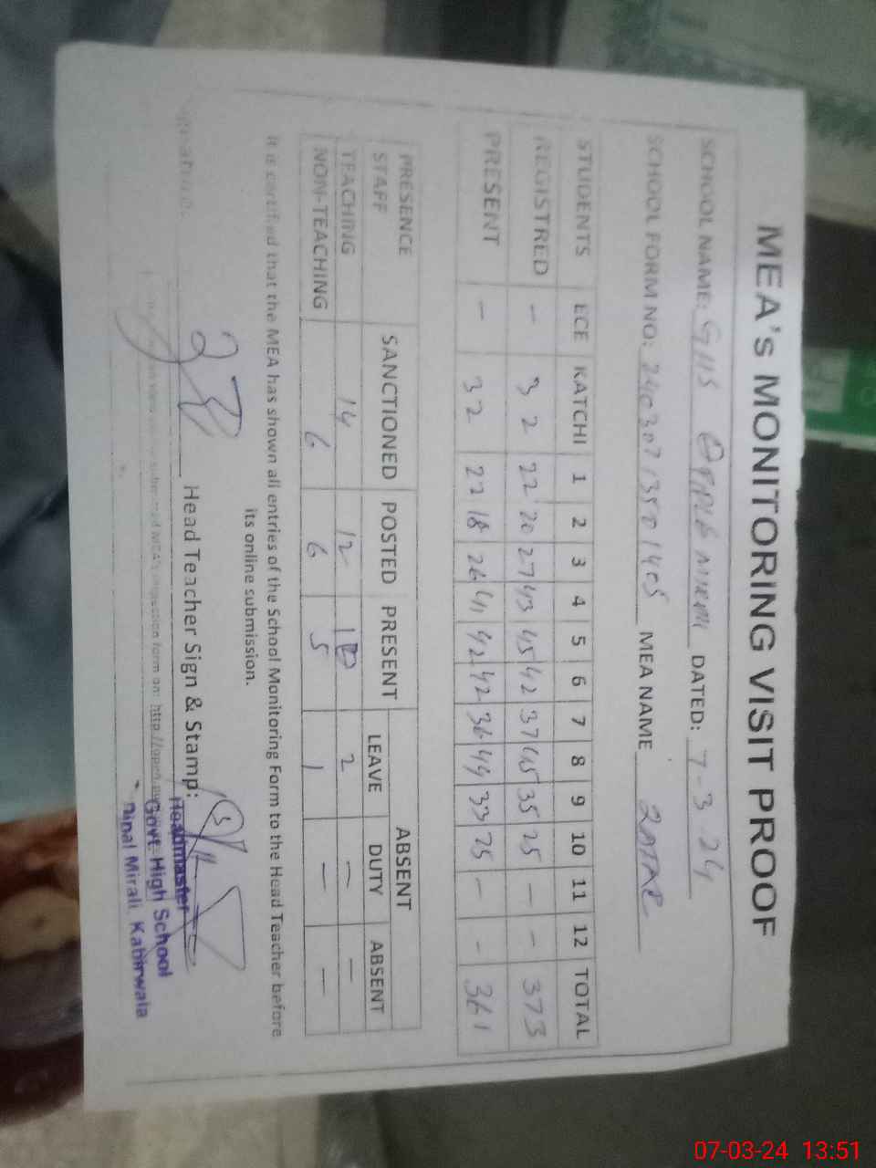 | Attendance Register | Head Teacher | MEA with School | Visit Proof |
