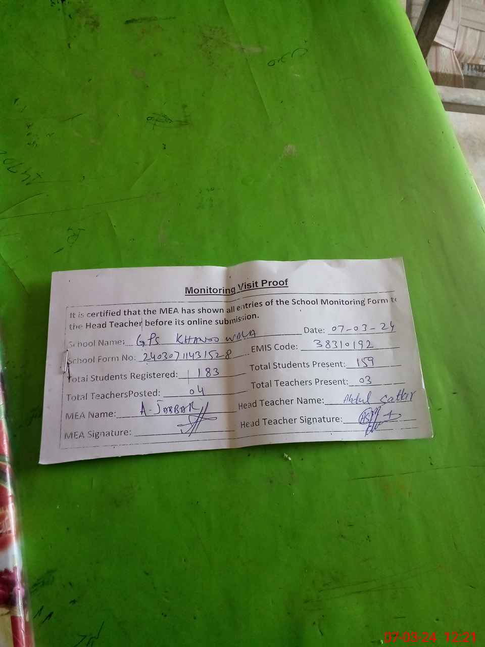 | Attendance Register | Head Teacher | MEA with School | Visit Proof |