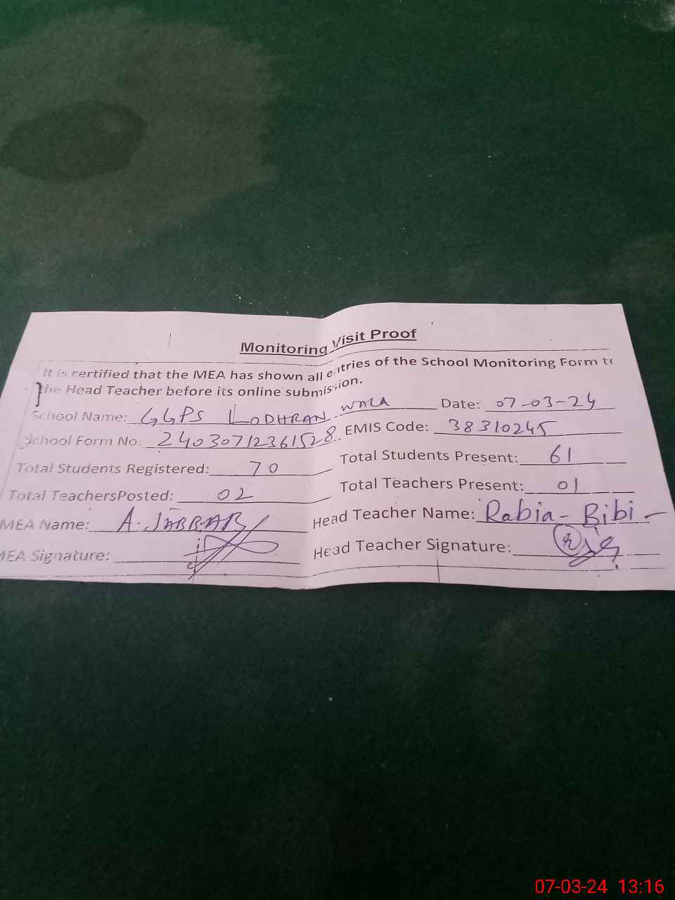 | Certified that this School was Inspected by the Undersigned MEA/DMO Today and the Information Stated Above is as Per Record. | |||||