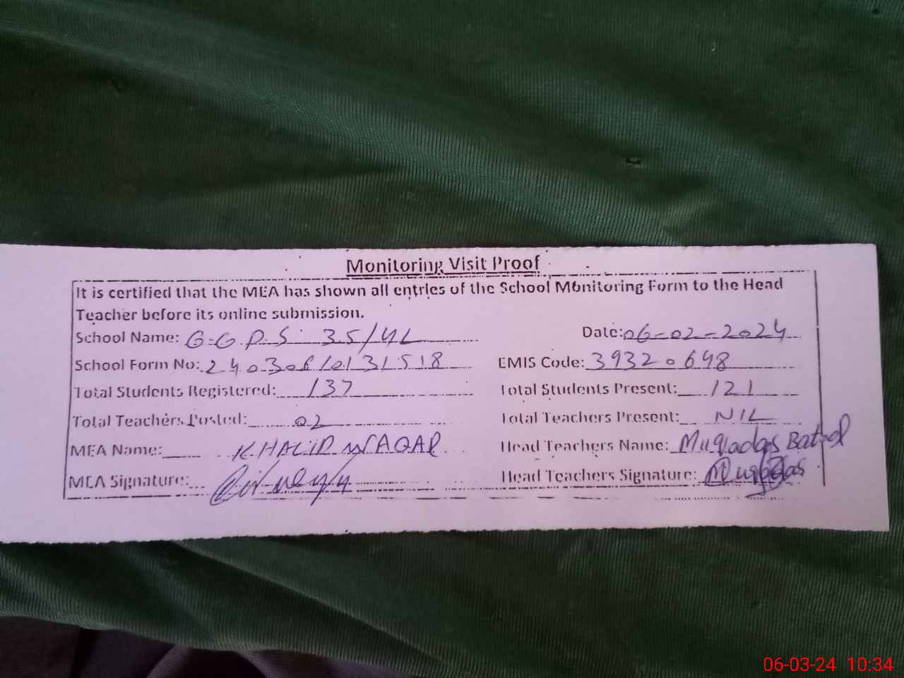 | Attendance Register | Head Teacher | MEA with School | Visit Proof |