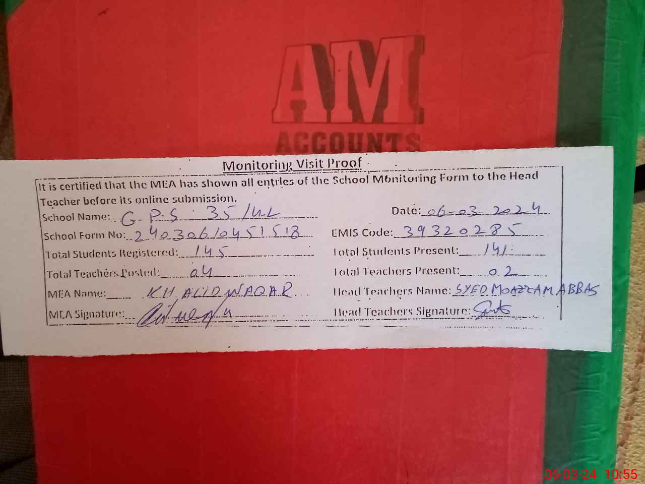 | Attendance Register | Head Teacher | MEA with School | Visit Proof |