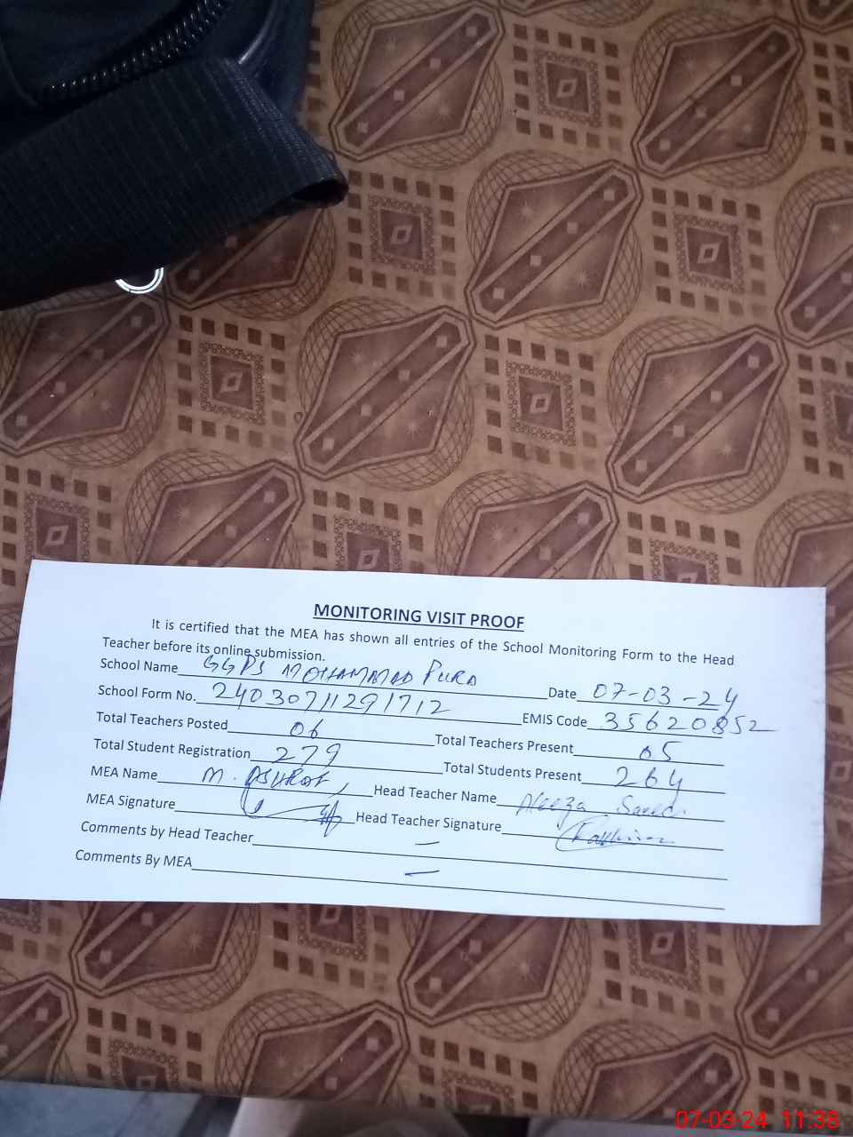 | Attendance Register | Head Teacher | MEA with School | Visit Proof |