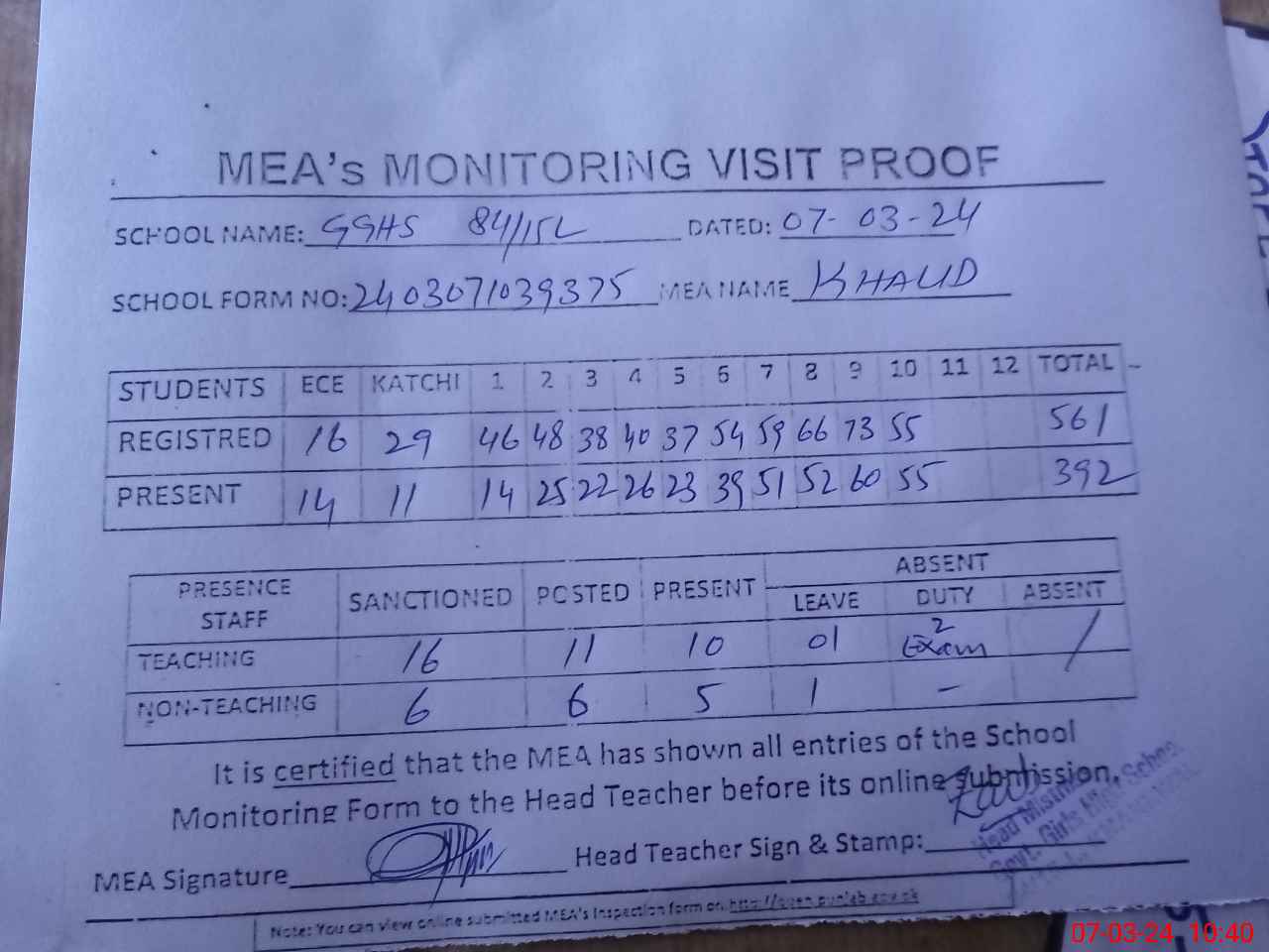 | Certified that this School was Inspected by the Undersigned MEA/DMO Today and the Information Stated Above is as Per Record. | |||||