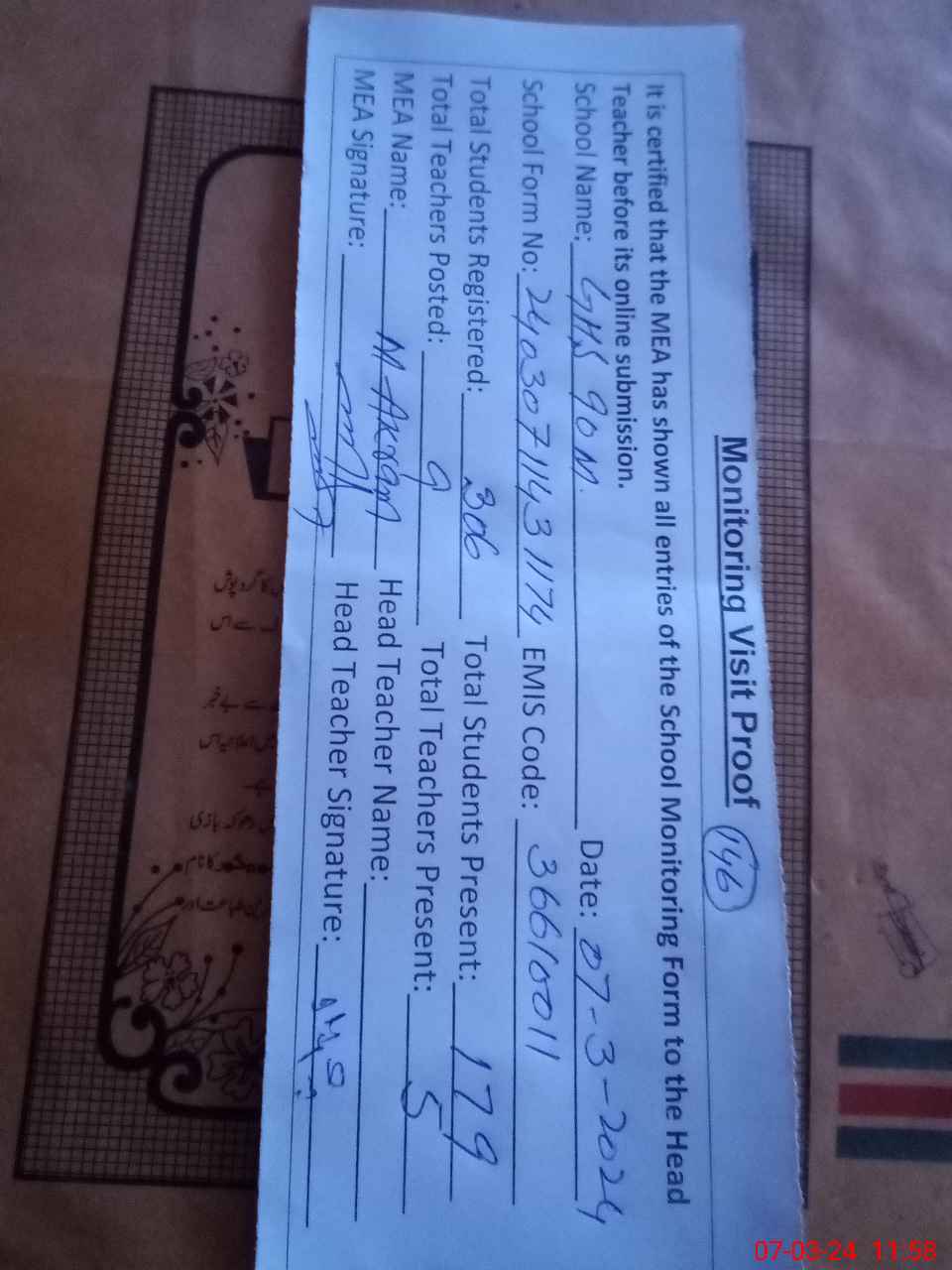 | Attendance Register | Head Teacher | MEA with School | Visit Proof |