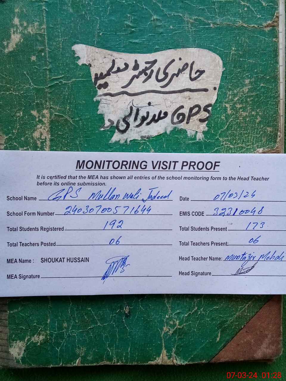 | EMIS Code: 32310048 | Name of School: GPS MULLAN WALI JADEED | |||