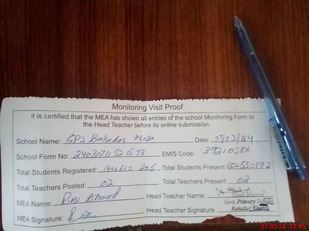 | Attendance Register | Head Teacher | MEA with School | Visit Proof |