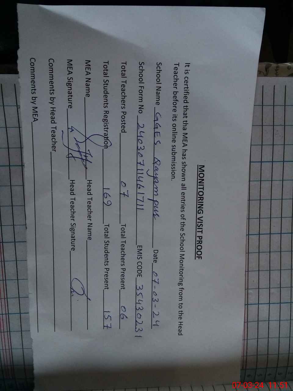 | Attendance Register | Head Teacher | MEA with School | Visit Proof |
