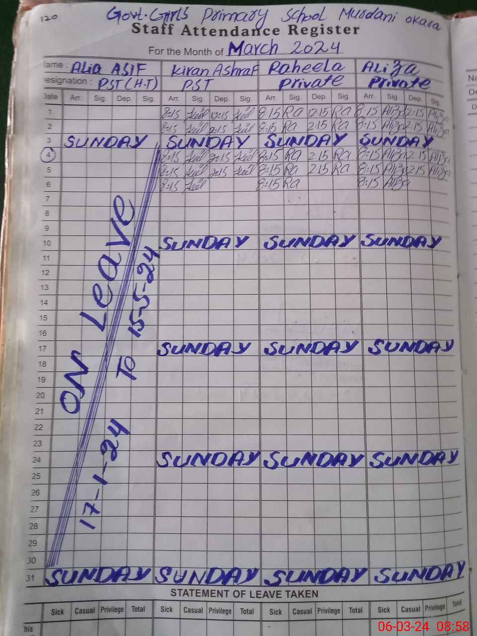 | Leave | Duty | Absent | Maternity | Medical | Ex- Pak |