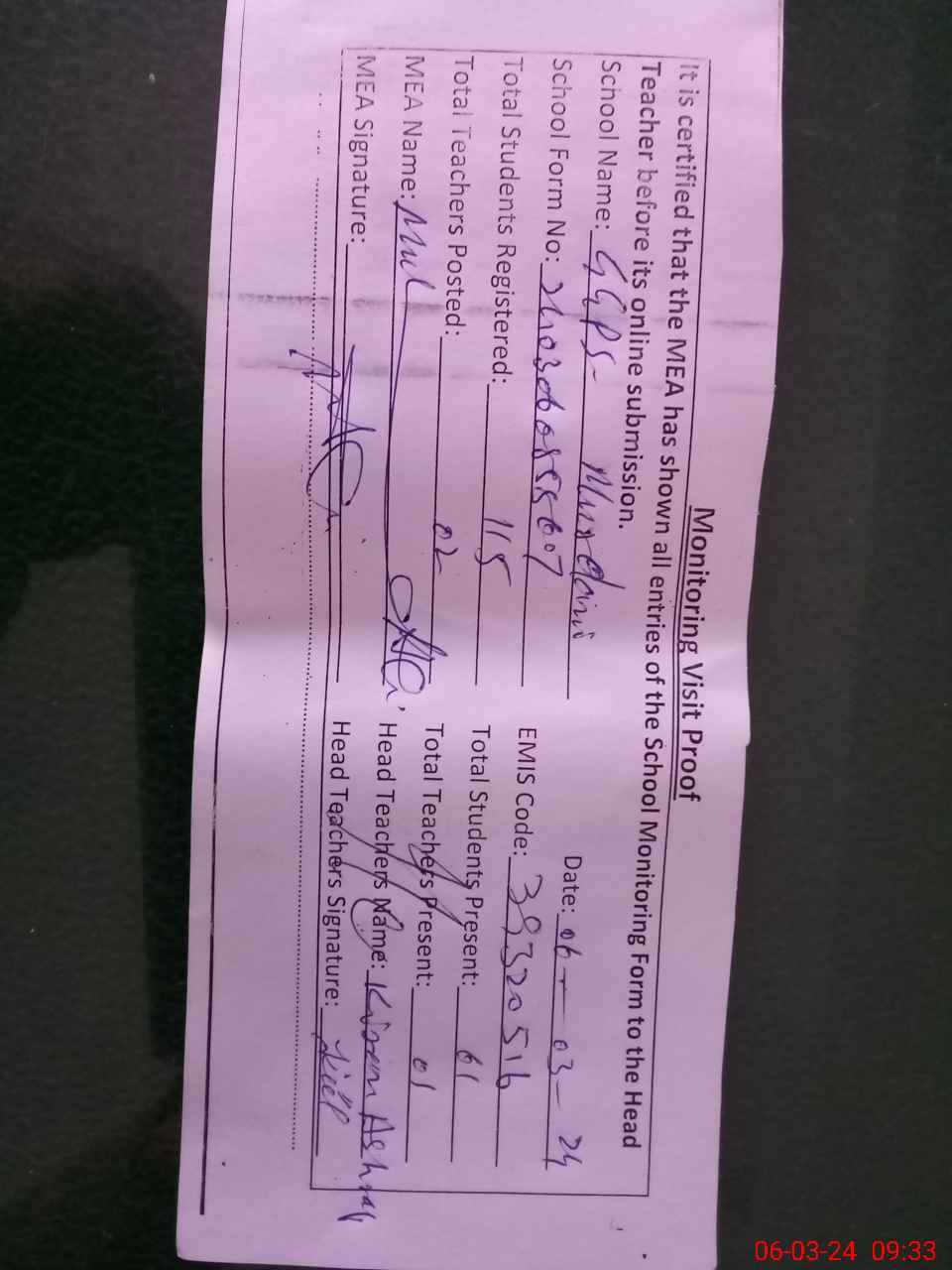 | Attendance Register | Head Teacher | MEA with School | Visit Proof |