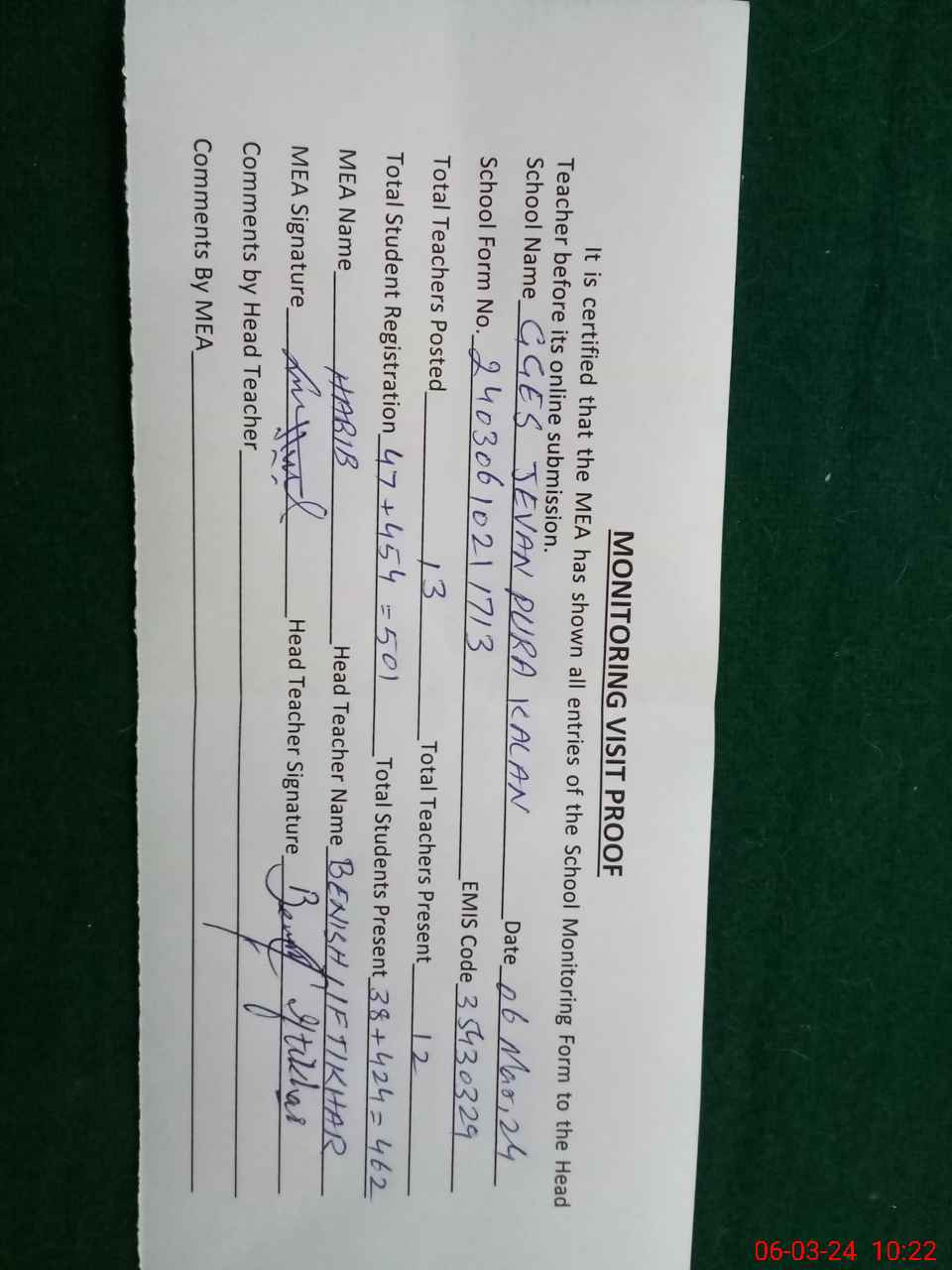 | Attendance Register | Head Teacher | MEA with School | Visit Proof |