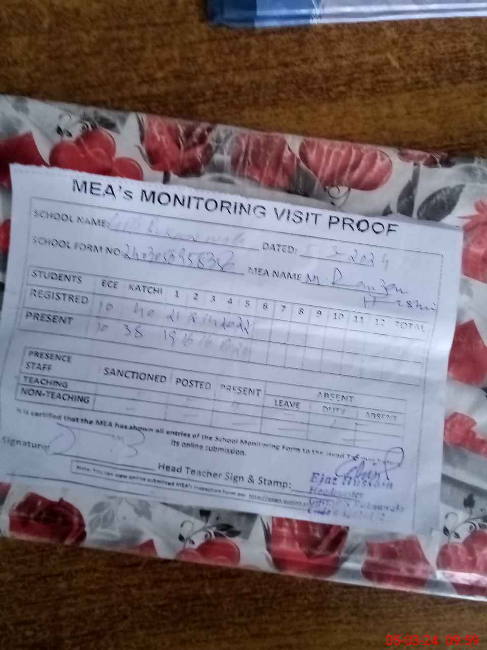 | Attendance Register | Head Teacher | MEA with School | Visit Proof |