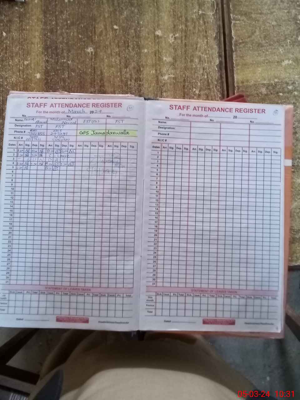 | CNIC | Full Name | Designation | R/C | Absence During Last Calender Month |