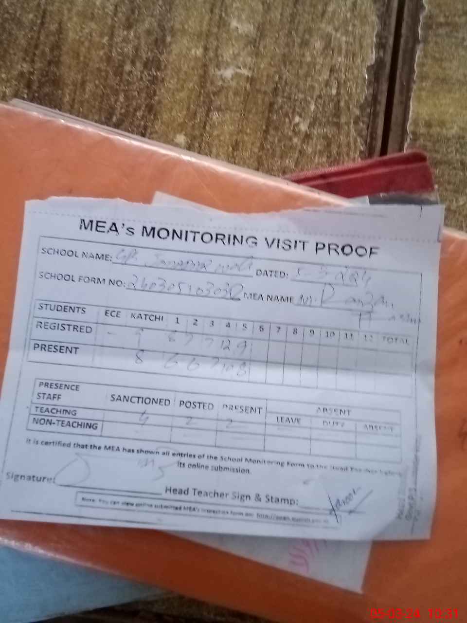 | Attendance Register | Head Teacher | MEA with School | Visit Proof |