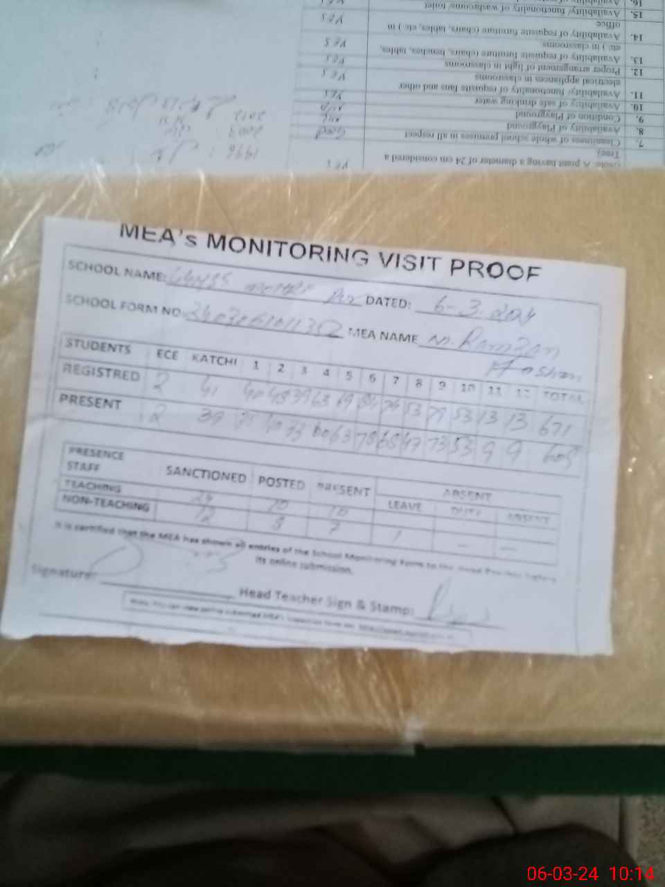 | Attendance Register | Head Teacher | MEA with School | Visit Proof |