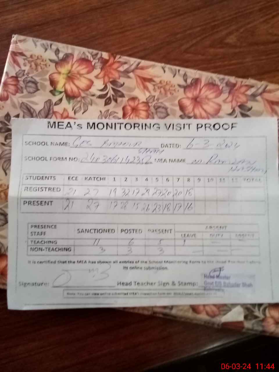 | Attendance Register | Head Teacher | MEA with School | Visit Proof |