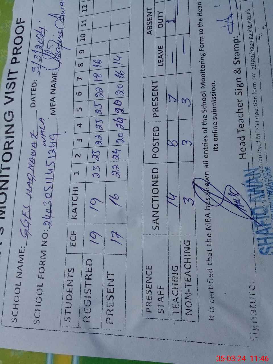 | Attendance Register | Head Teacher | MEA with School | Visit Proof |