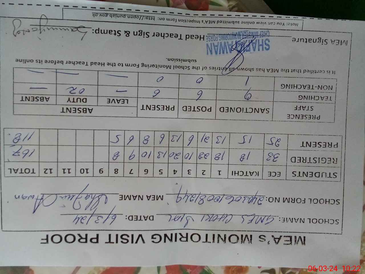 | Certified that this School was Inspected by the Undersigned MEA/DMO Today and the Information Stated Above is as Per Record. | |||||