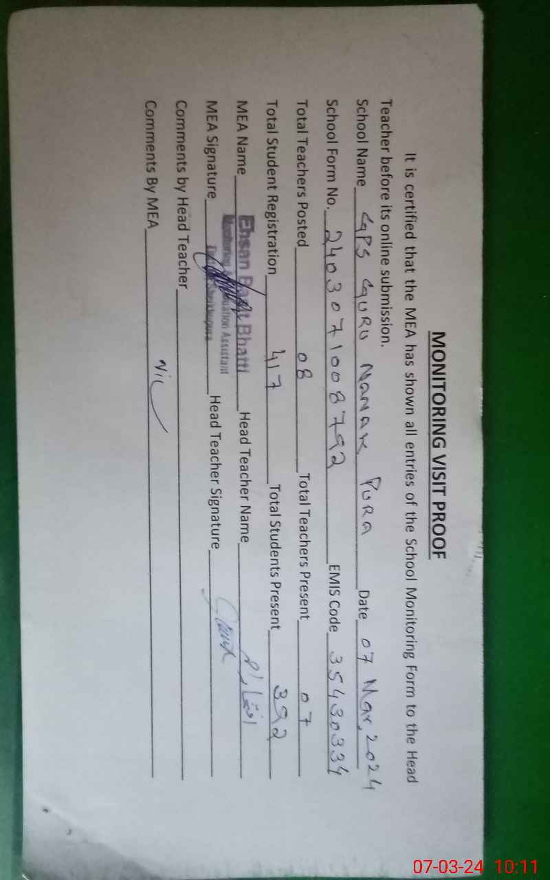 | EMIS Code: 35430334 | Name of School: GPS GURU NANAK PURA | |||