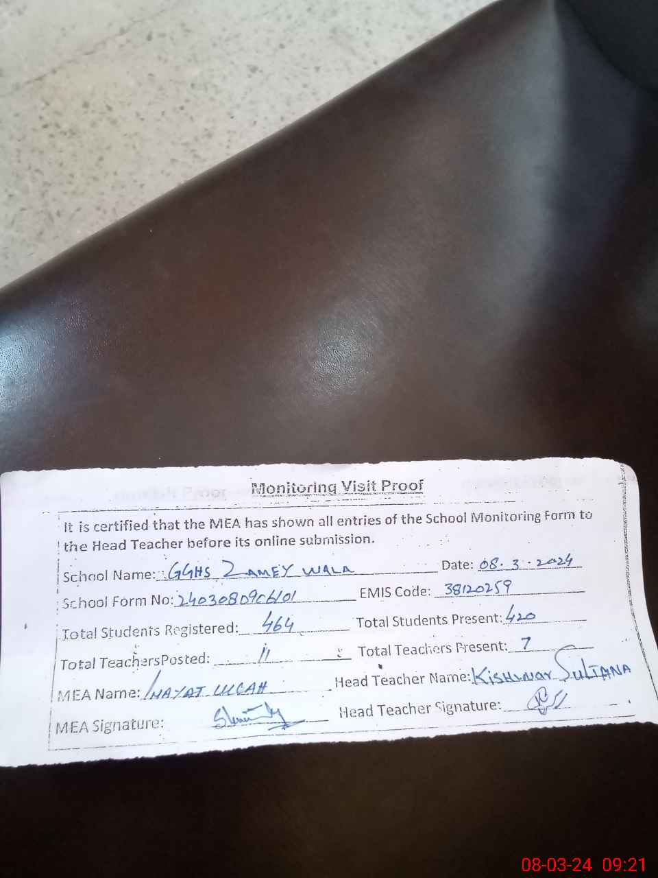 | Attendance Register | Head Teacher | MEA with School | Visit Proof |