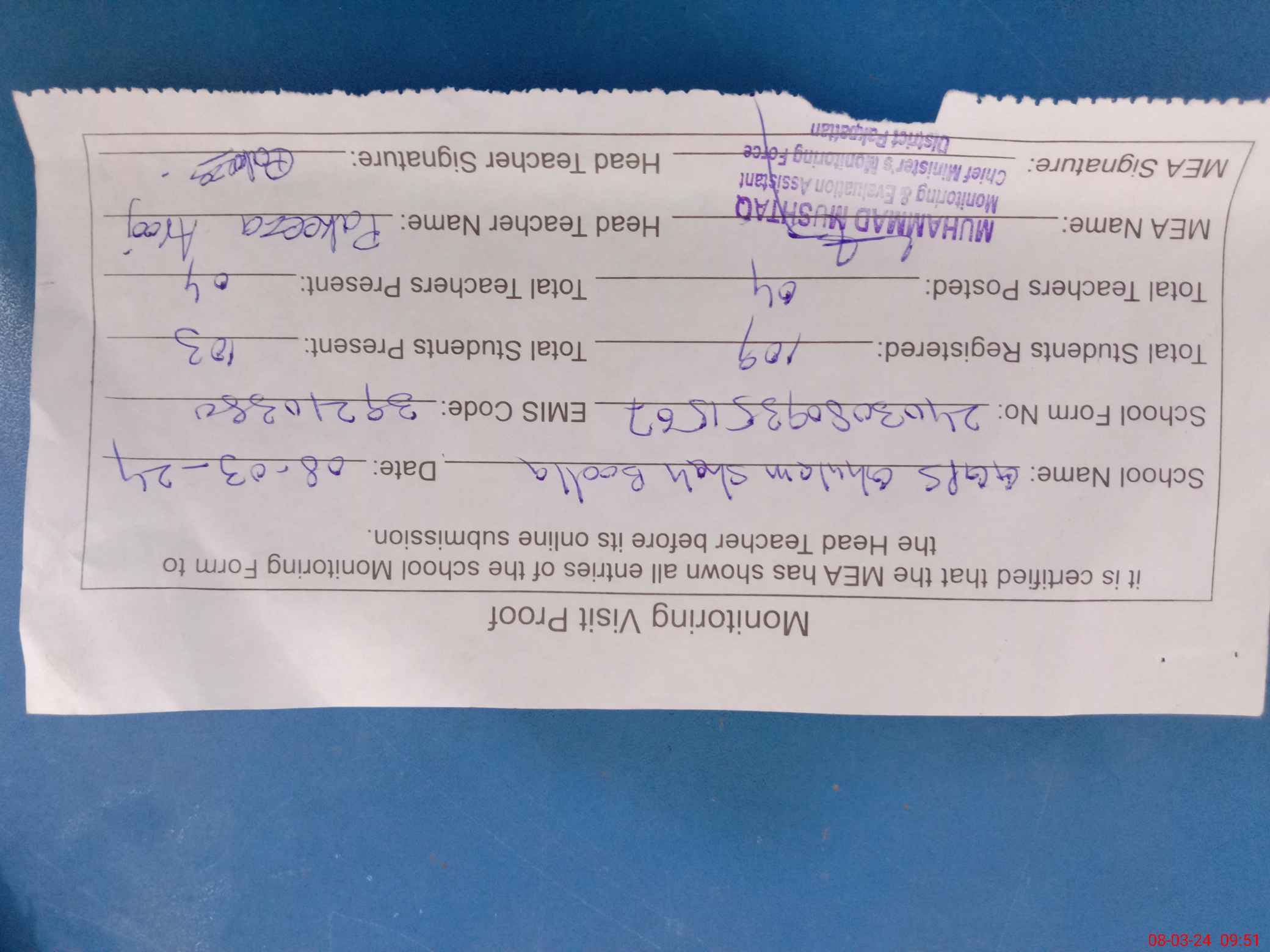 | Attendance Register | Head Teacher | MEA with School | Visit Proof |