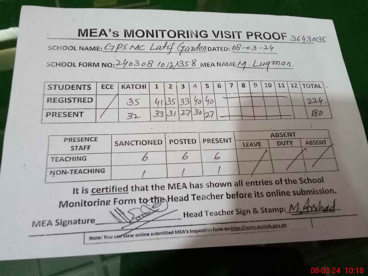 | Attendance Register | Head Teacher | MEA with School | Visit Proof |