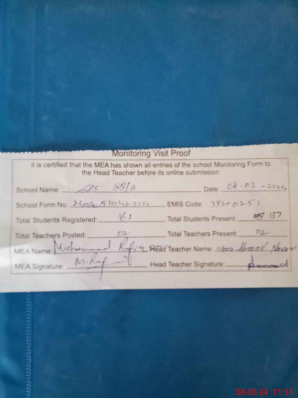 | Certified that this School was Inspected by the Undersigned MEA/DMO Today and the Information Stated Above is as Per Record. | |||||