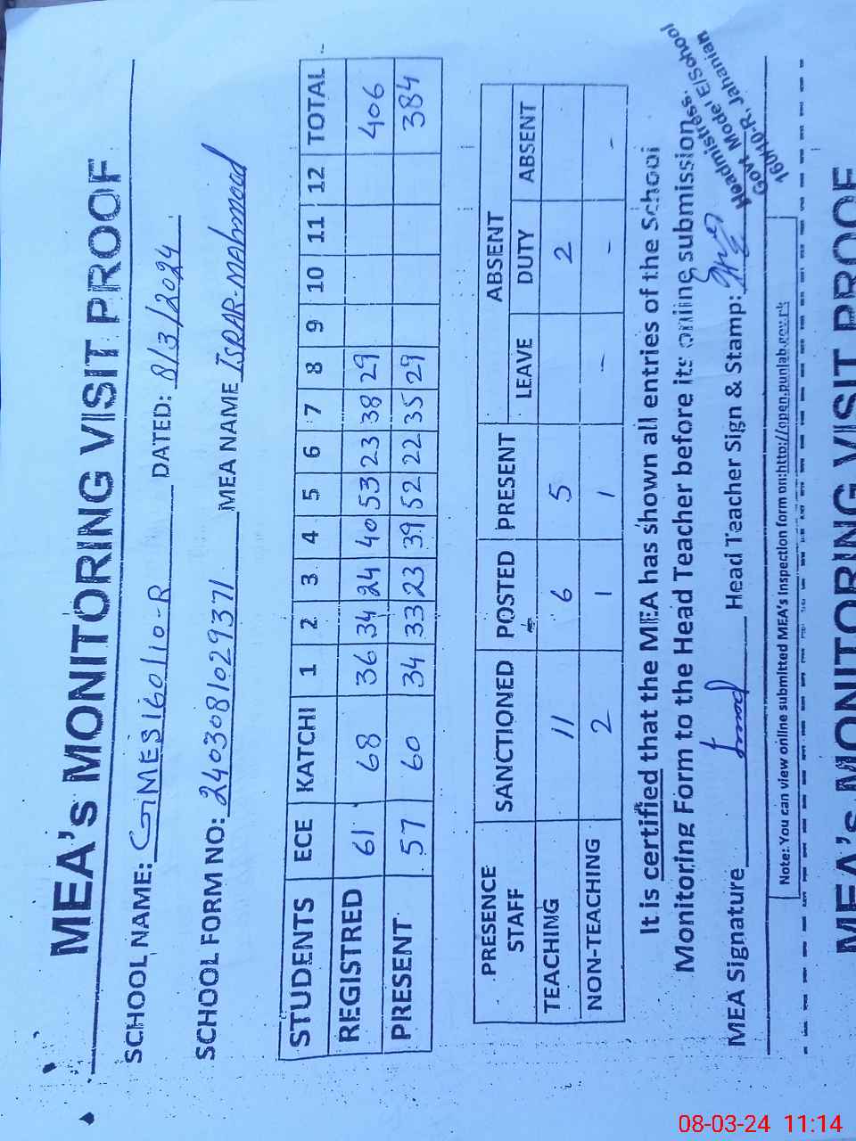 | Attendance Register | Head Teacher | MEA with School | Visit Proof |