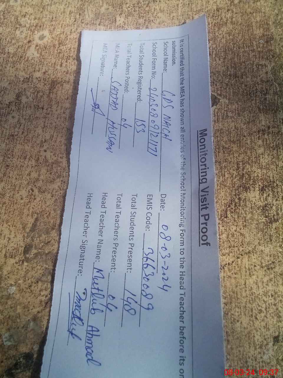 | Attendance Register | Head Teacher | MEA with School | Visit Proof |