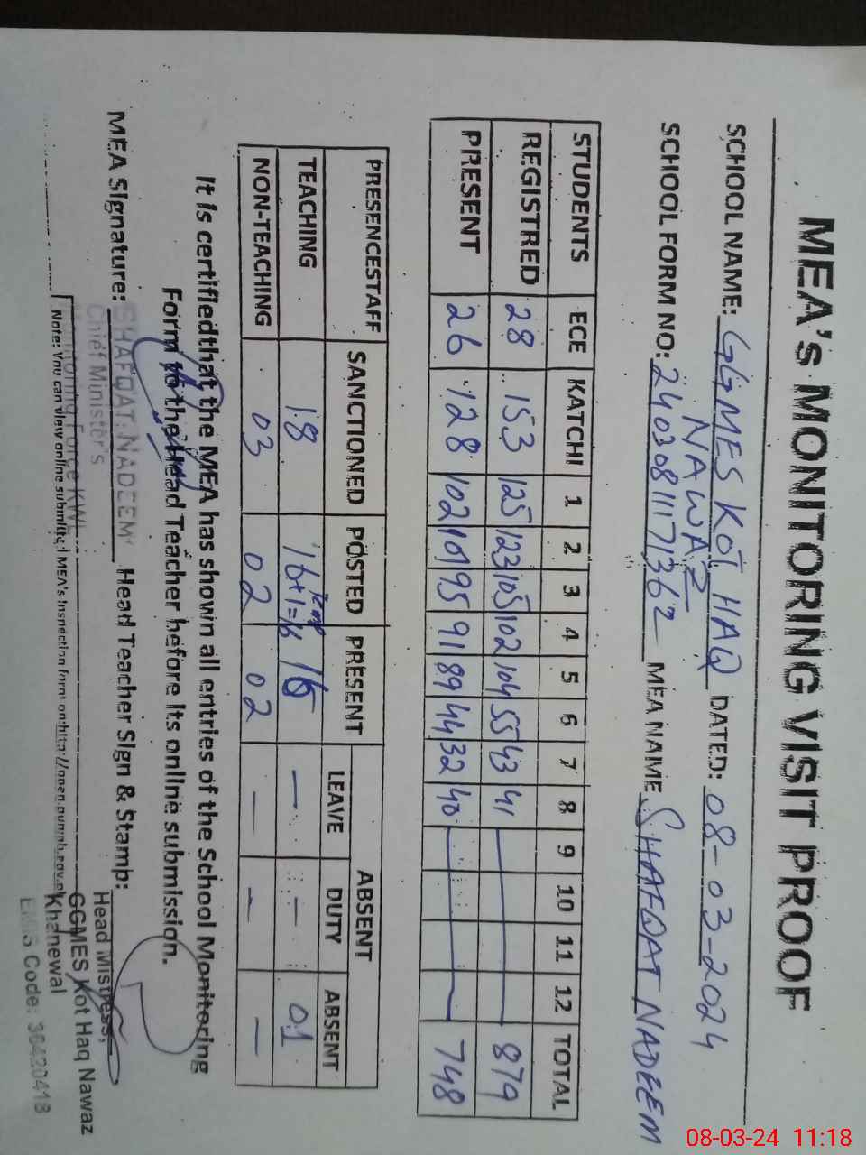 | Attendance Register | Head Teacher | MEA with School | Visit Proof |