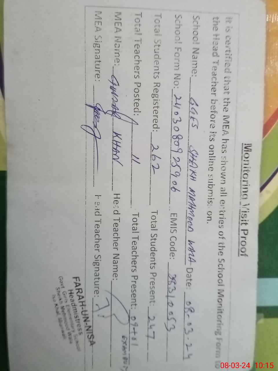 | Attendance Register | Head Teacher | MEA with School | Visit Proof |