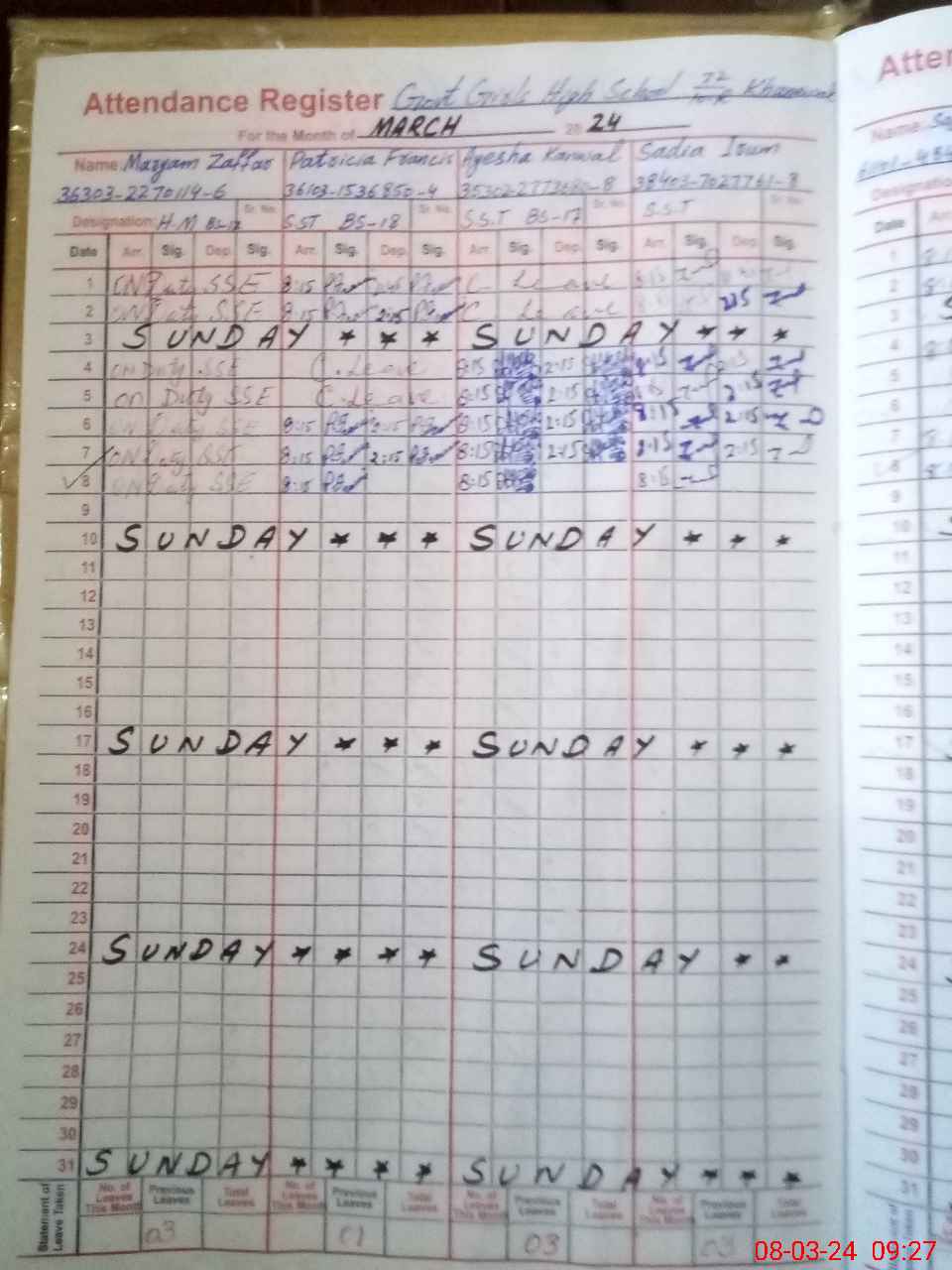 | 36**** | Ma**** Za**** | 8 | 1 | 0 | 0 | 0 | 0 | 0 | 0 | 0 | 0 | 0 | Exam Duty |