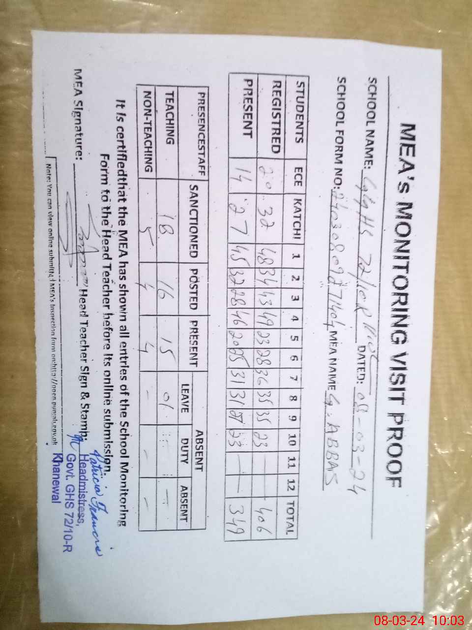| Attendance Register | Head Teacher | MEA with School | Visit Proof |