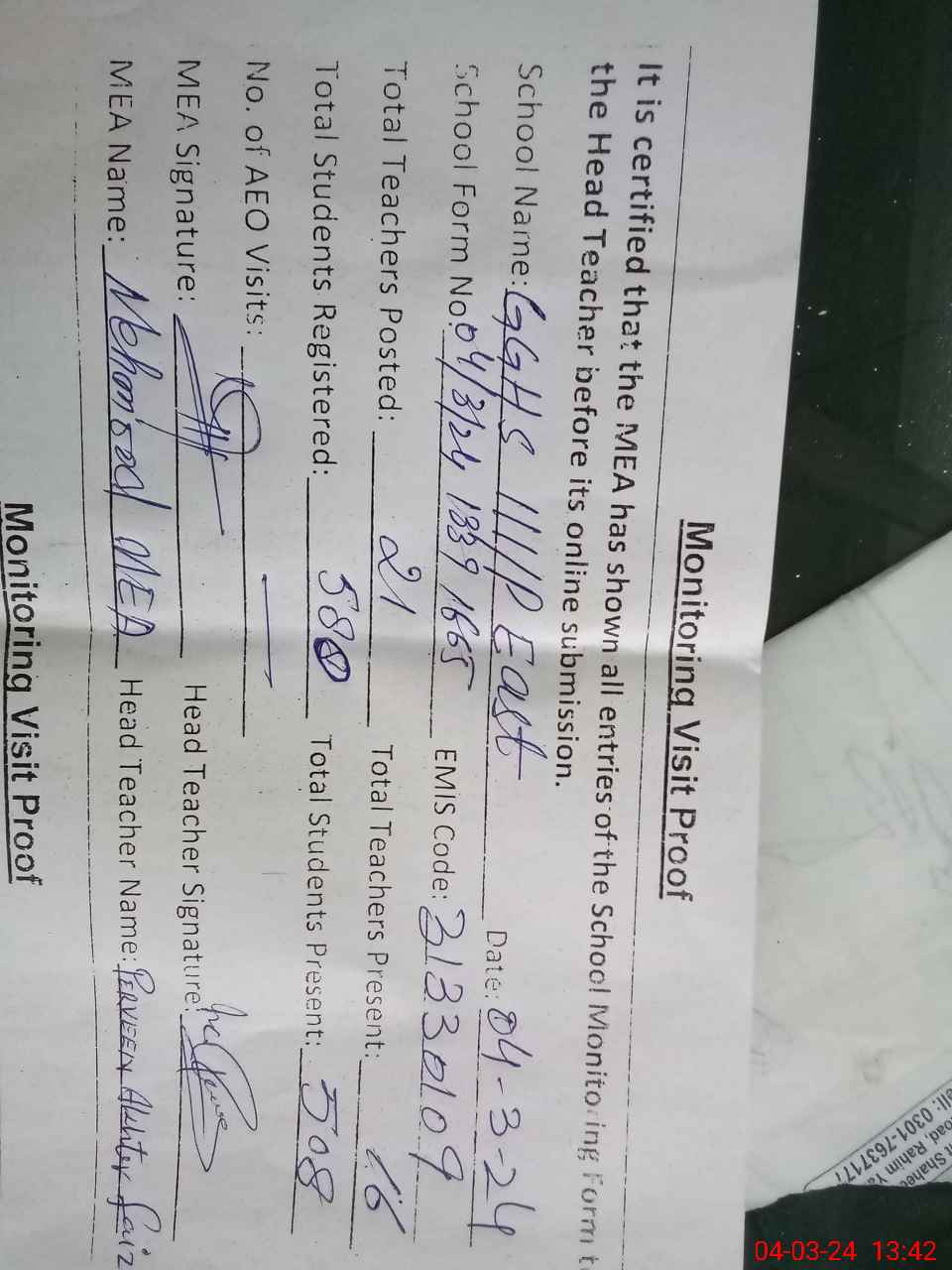 | Attendance Register | Head Teacher | MEA with School | Visit Proof |