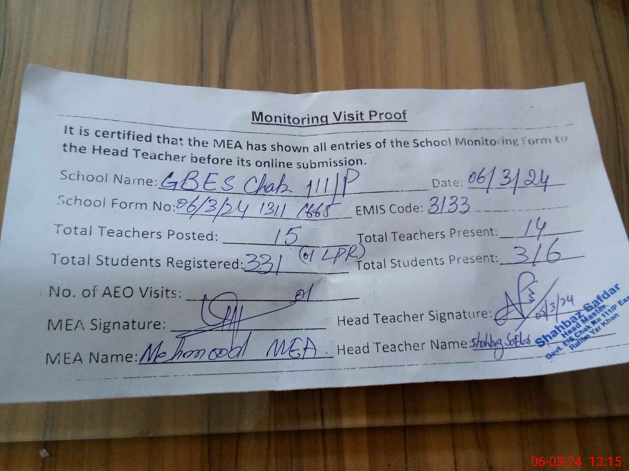 | Attendance Register | Head Teacher | MEA with School | Visit Proof |