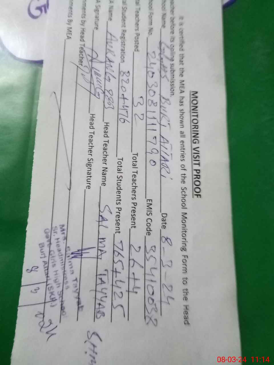 | Attendance Register | Head Teacher | MEA with School | Visit Proof |
