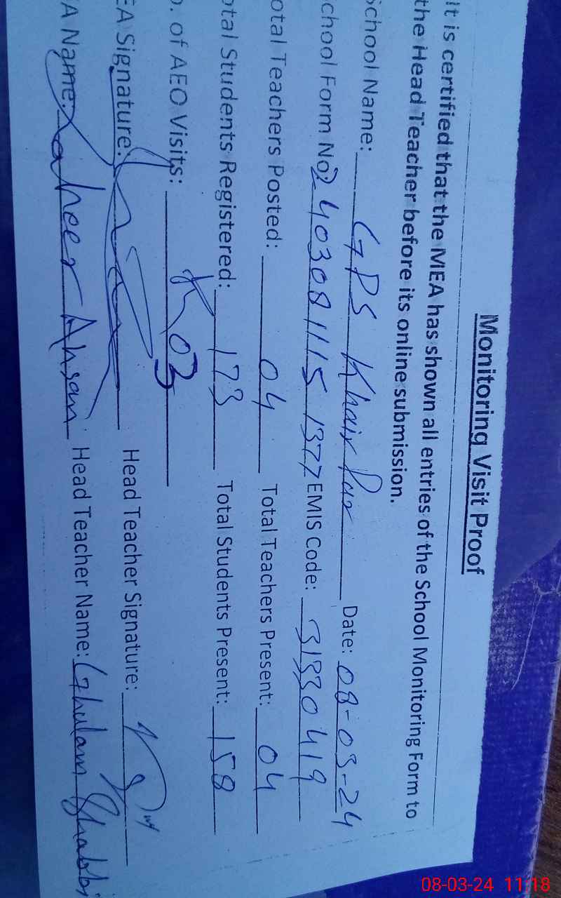 | Name: GH**** SH**** Designation: (School Headmaster's/Headmistress's) PST Phone/Cell Number: 03**** |
