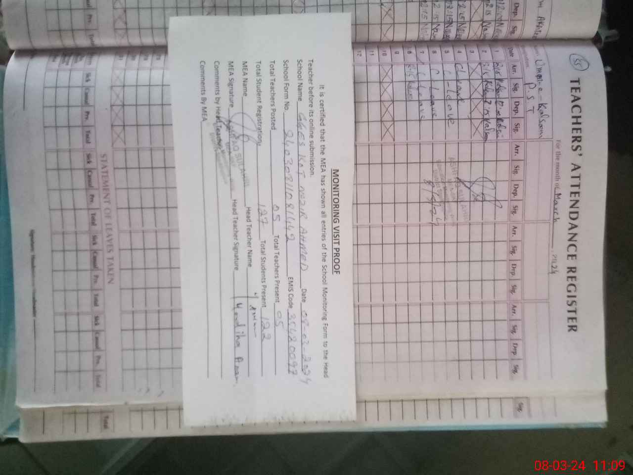 | Attendance Register | Head Teacher | MEA with School | Visit Proof |