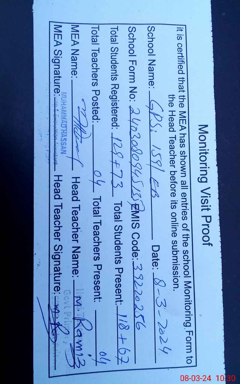 | EMIS Code: 39220256 | Name of School: GPS 159 EB P.O ARIF WALA | |||
