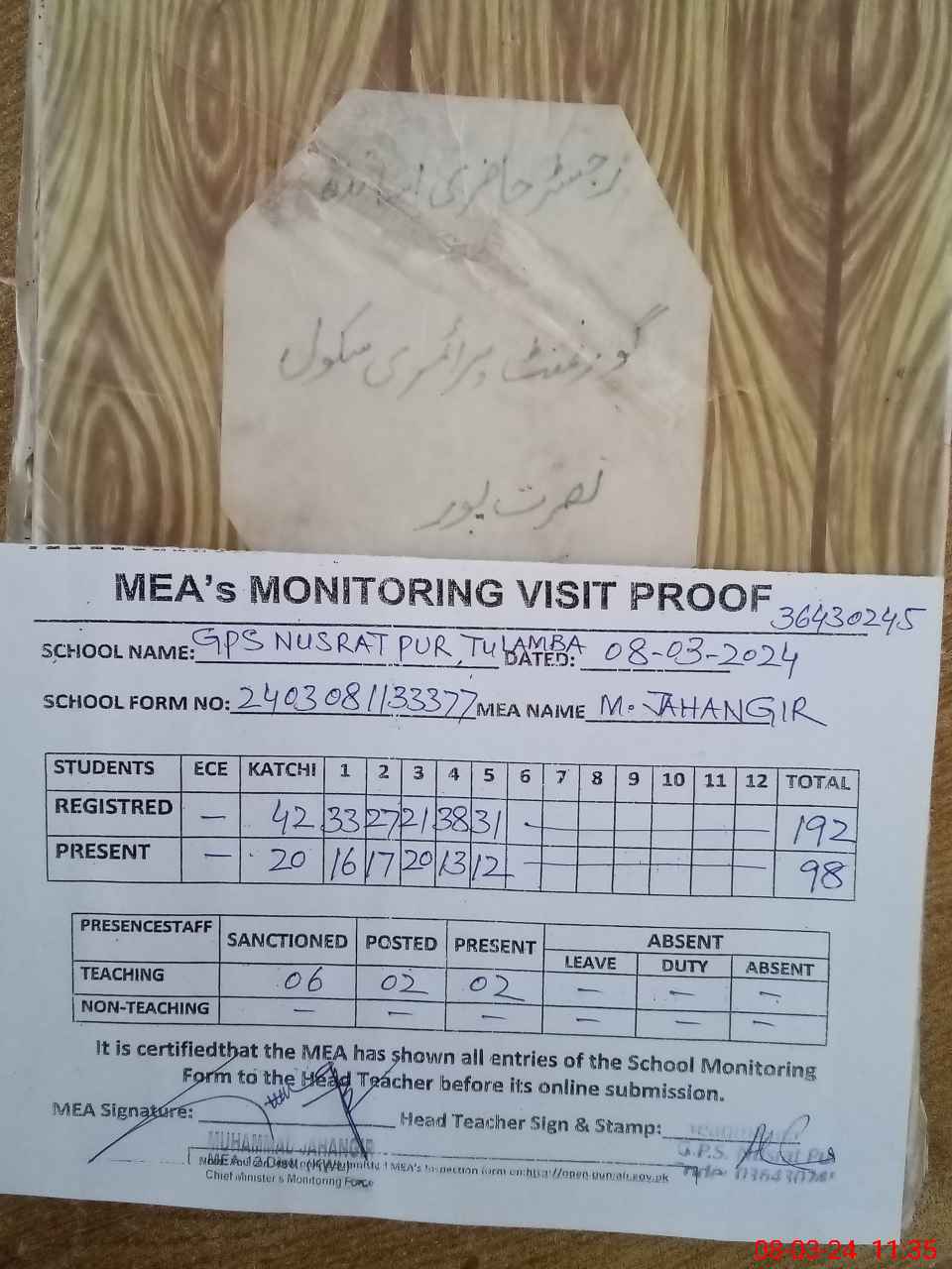 | EMIS Code: 36430245 | Name of School: GPS NUSRAT PUR, P/O ROTLA, TULAMBA (PEF,PSSP PHASE II) Not yet handedover | |||