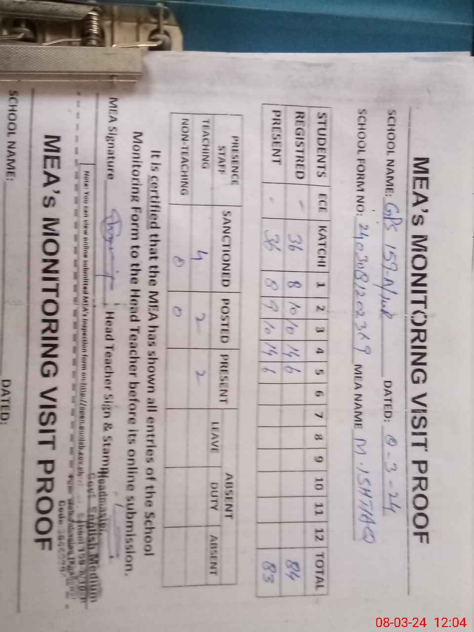 | Monitoring Date: 08-03-2024 | Start Time: 08-03-2024 11:30 AM | End Time: 08-03-2024 12:07 PM | Name of MEA: M.Is**** (S**** 03**** | |