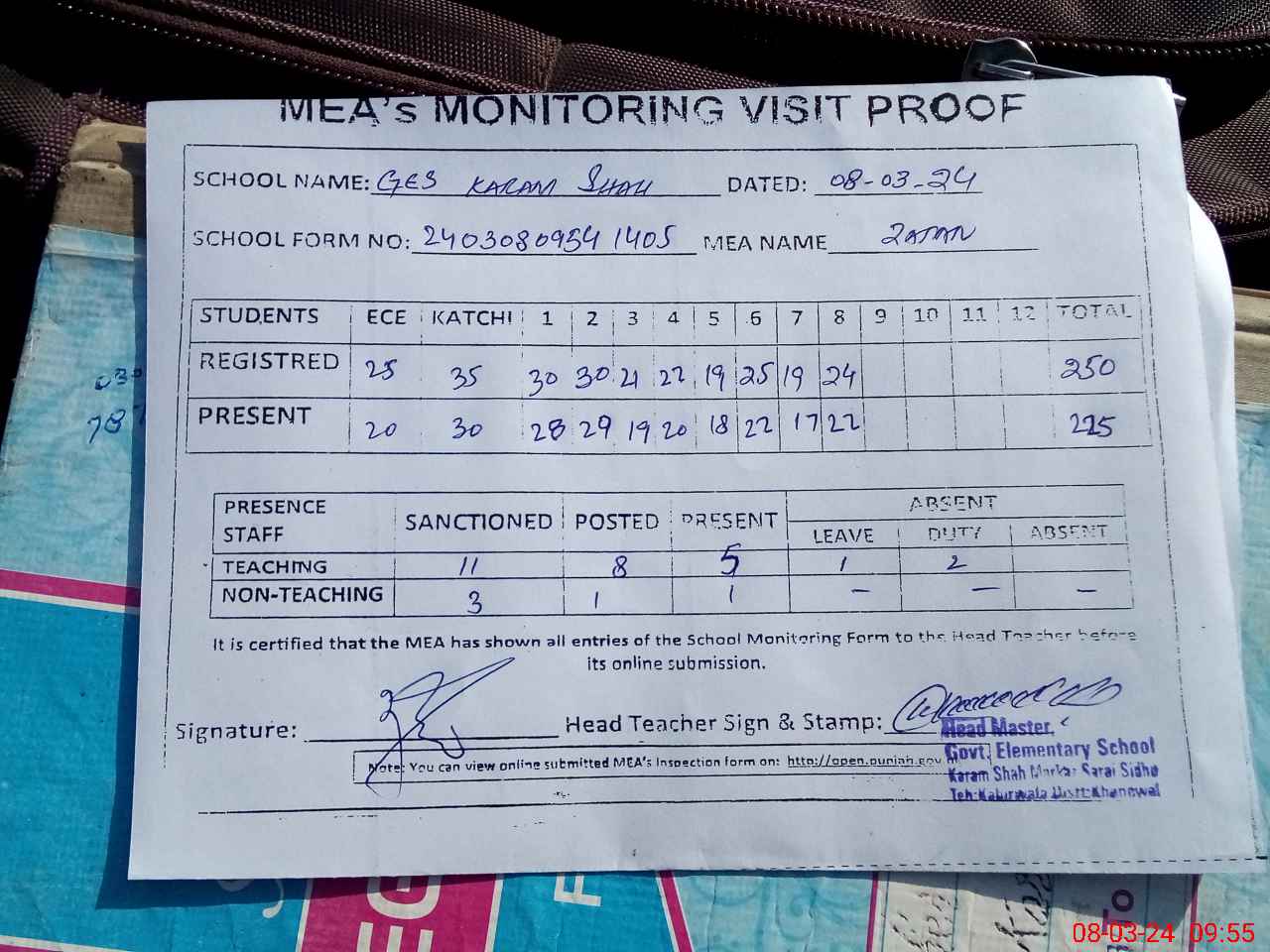 | Attendance Register | Head Teacher | MEA with School | Visit Proof |