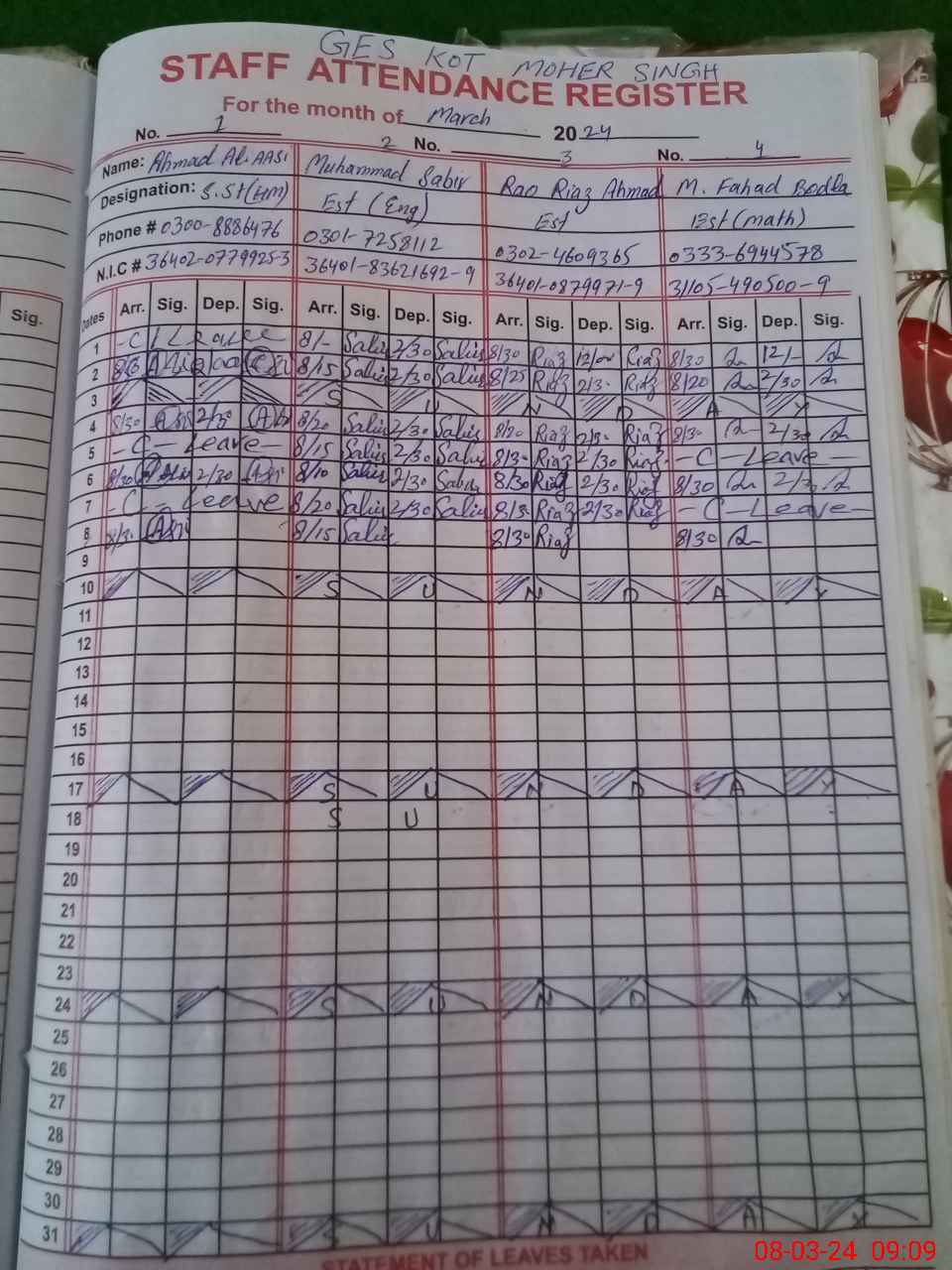 | CNIC | Full Name | Designation | R/C | Absence During Last Calender Month |