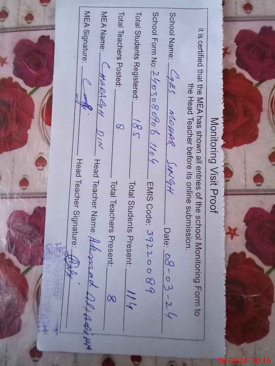 | Attendance Register | Head Teacher | MEA with School | Visit Proof |