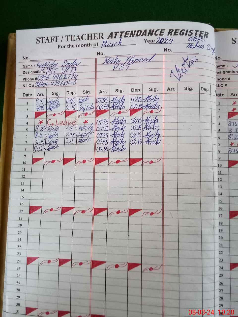 | CNIC | Full Name | Designation | R/C | Absence During Last Calender Month |