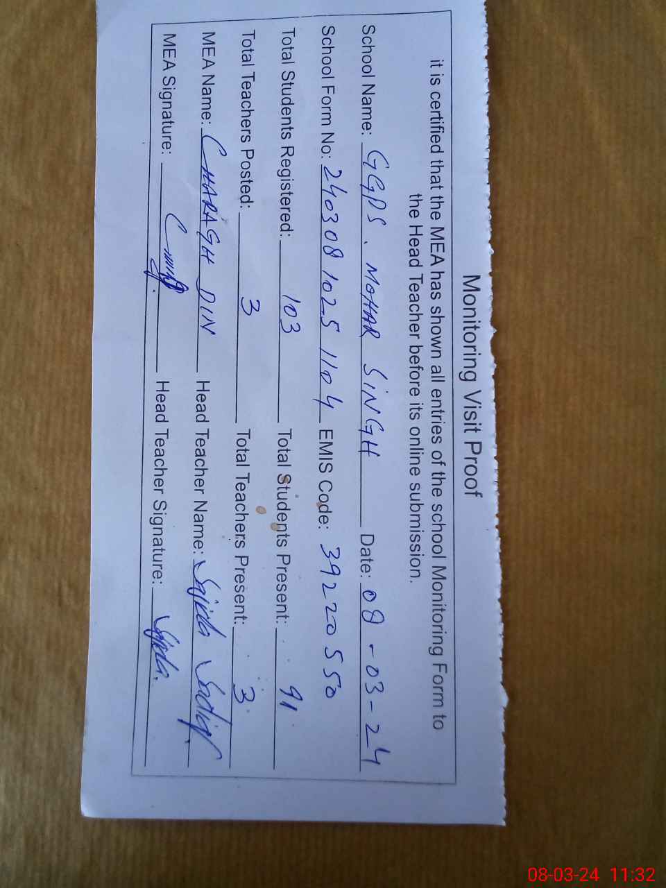 | Attendance Register | Head Teacher | MEA with School | Visit Proof |