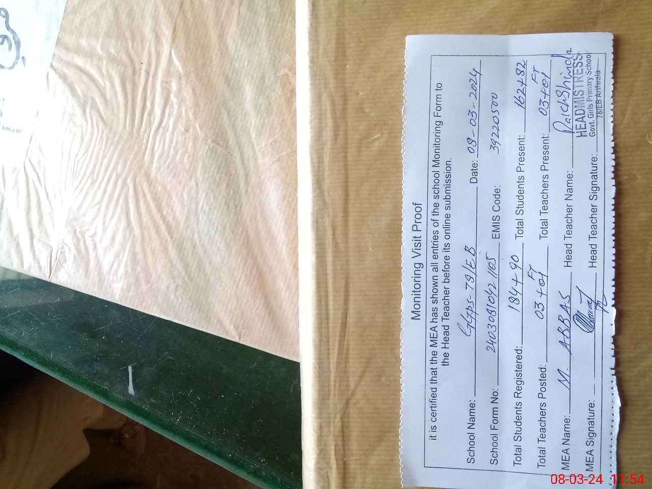 | Attendance Register | Head Teacher | MEA with School | Visit Proof |