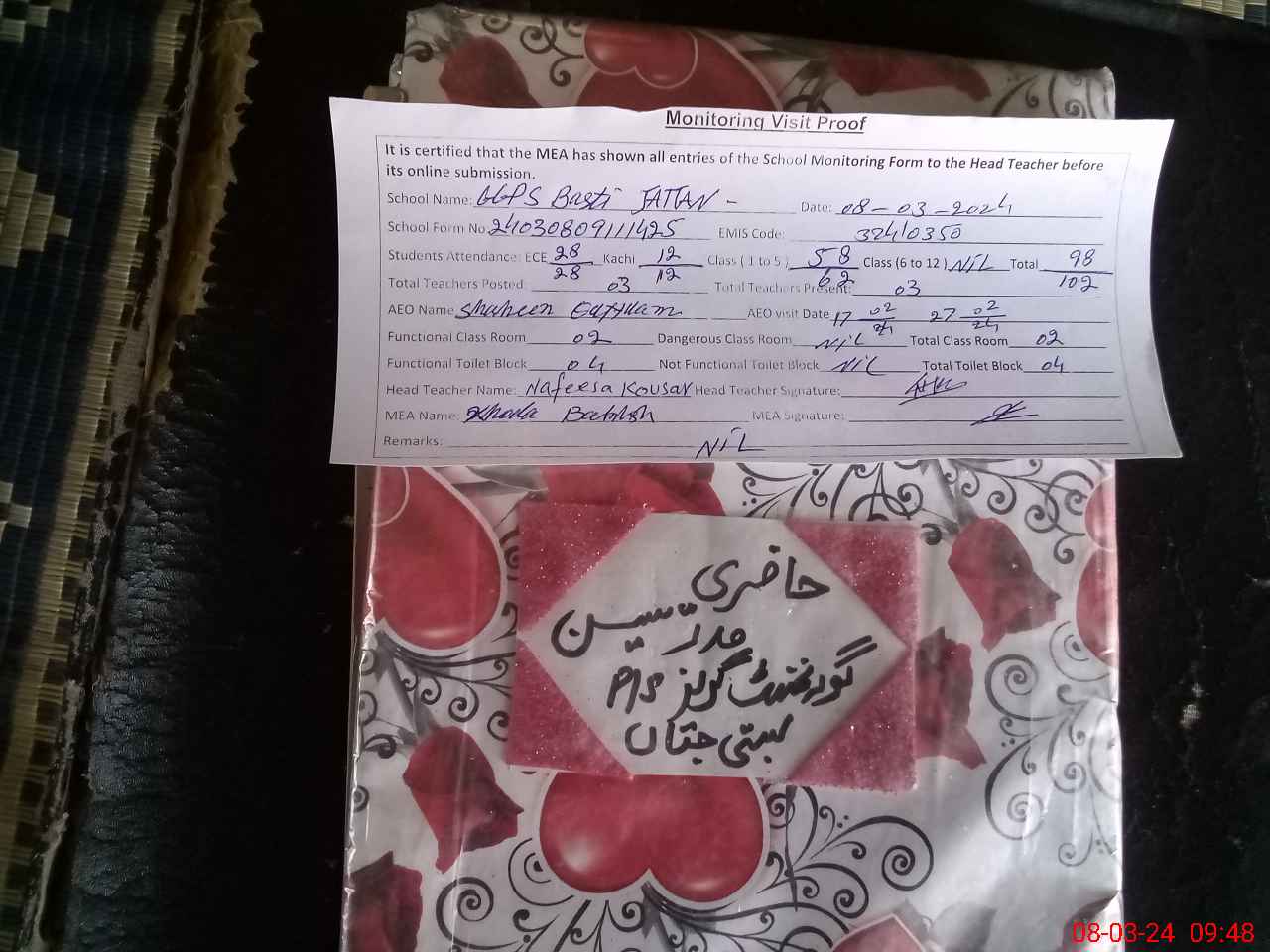 | Certified that this School was Inspected by the Undersigned MEA/DMO Today and the Information Stated Above is as Per Record. | |||||