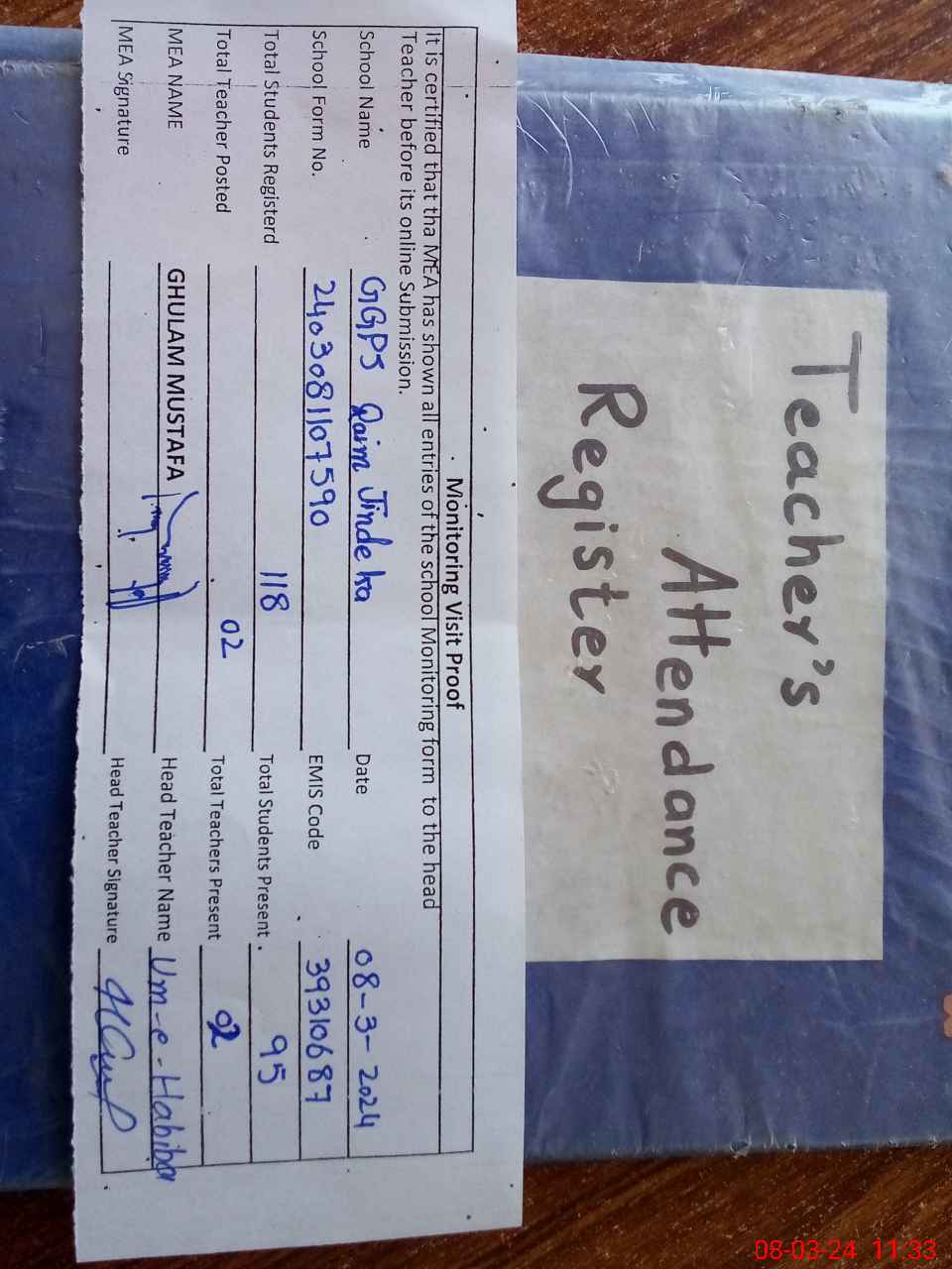 | Attendance Register | Head Teacher | MEA with School | Visit Proof |